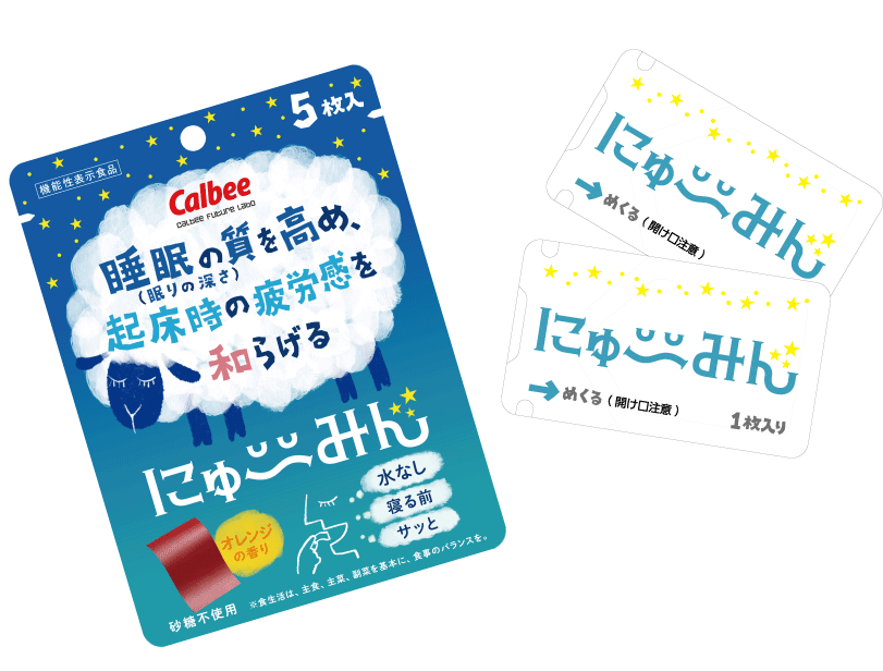 にゅ〜みんという商品名から、寝つきが良くなるといったイメージをもってしまいがちですが、クロセチンは眠りの深さを向上することで、睡眠の質を高めるといった機能性になります。